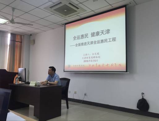 5月6日上午,天津体育局群体处长白戈瑞受邀为2015级部分体育人文社会学专业的硕士研究生和公共事业管理专业的本科生做了题为“全运惠民健康天津——全面推进天津全运惠民工程”的学术报告。我校全民健身创新团队相关教师参会。报告会由社科中心常务副主任王旭光教授主持。